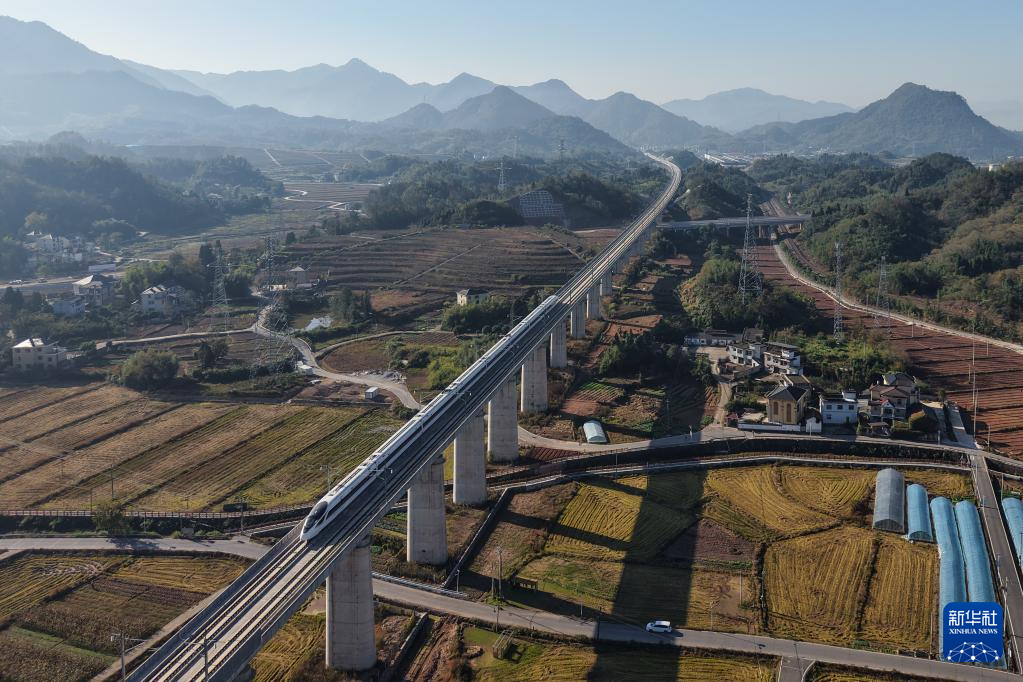 11月20日,G55612次试验列车在杭衢高铁罗村大桥上运行(无人机照片)。 11月20日,首趟试验列车G55611次从建德站出发,沿新建的杭衢高铁开往江山站,进行列车时刻参数测试,这标志着杭衢高铁建设已进入测试阶段,预计12月底即可投入运营。新华社记者 黄宗智 供图